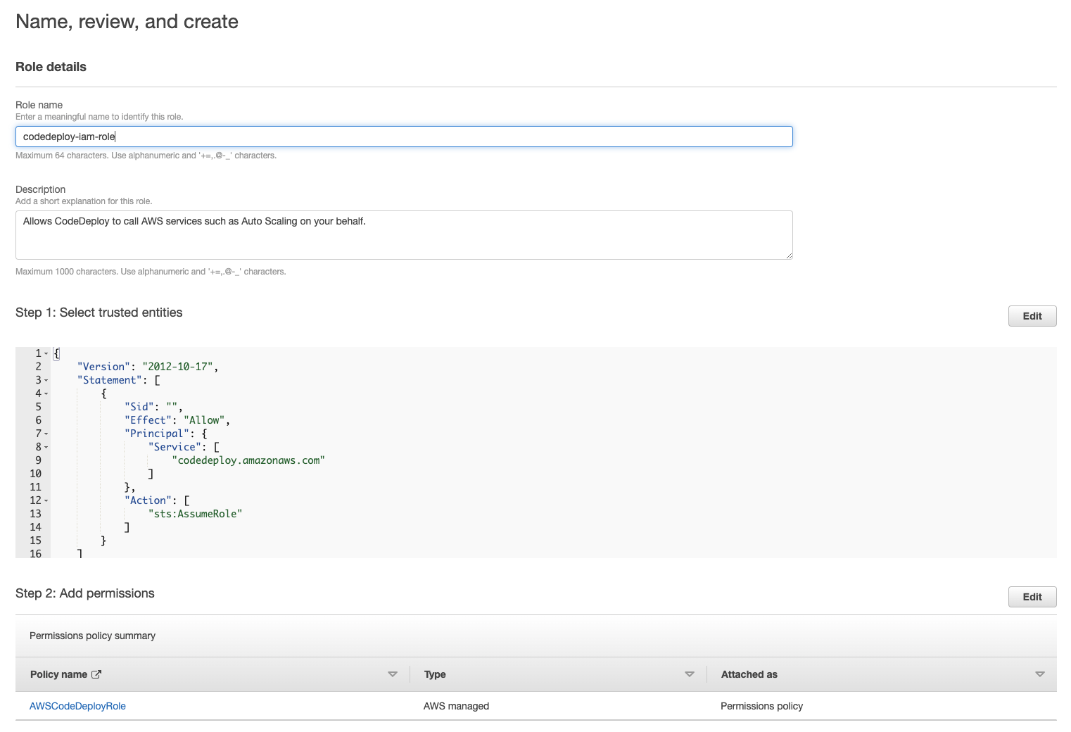 μλ λ°°ν¬κ° μ€νλλ κ³Όμ μμ EC2 λ S3μ CodeDeploy μ CodePipeline μ CodeDeploy μ μ¬λ¬ μ 보(GitHub κ³μ μ°λ μ 보μ κ°μ) μ μ κ·ΌνκΈ° λλ¬Έμ, μ΄ 2κ°μ IAM Role μμ±μ΄ νμνλ€. IAM - Role - Create Role μ ν΄λ¦νμ¬, μλμ κ°μ΄ IAM Role μ κ°κ° νμν Policyλ₯Ό λΆμ¬νλ€. λ¨, S3 μ λν Permissions μ κ²½μ° μ΄λ²μλ AmazoneS3FullAccess Policy λ₯Ό λΆμ¬νμ§λ§, μ€μ λ‘λ νμν S3 Bucket λ§μΌλ‘ λ²μλ₯Ό μ’νμ μ€μ νλ κ²μ κΆμ₯νλ€.