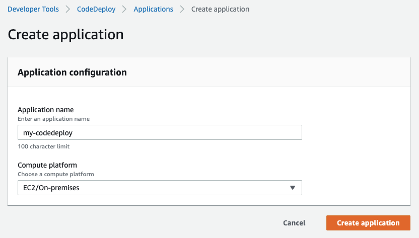 μμμλ μ κΉ μ΄μΌκΈ°νμ§λ§, CodeDeploy μ μ€μ μλ Applications κ³Ό Deployment groups μμ±μ΄ νμνλ€. CodeDeploy - Deploy - Applications - Create application μ ν΄λ¦νμ¬, μλμ κ°μ΄ μ λ ₯ν΄μ€λ€. νΉμ λ°°ν¬ λμμ΄ EC2 κ° μλλΌλ©΄, Compute platform μμ λ°°ν¬νκ³ μ νλ λμμ μ ννλ©΄ λλ€.